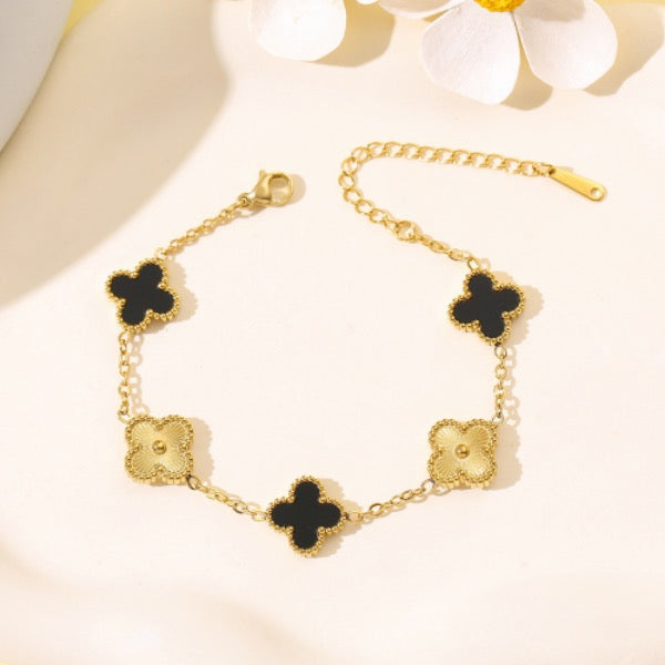 This stylish Gold Clover Bracelet is the perfect addition to any wardrobe. Crafted with a stainless steel pendant, the bracelet features Clover charms with colour on both sides, and is finished with a beautiful gold patterned edging. Tarnish and Water Resistant.