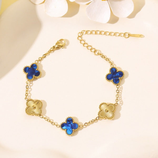 This stylish Gold Clover Bracelet is the perfect addition to any wardrobe. Crafted with a stainless steel pendant, the bracelet features Clover charms with colour on both sides, and is finished with a beautiful gold patterned edging. Tarnish and Water Resistant.