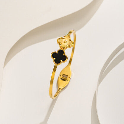 Stainless Steel Double Enamel Clover Bangle-Black/Gold