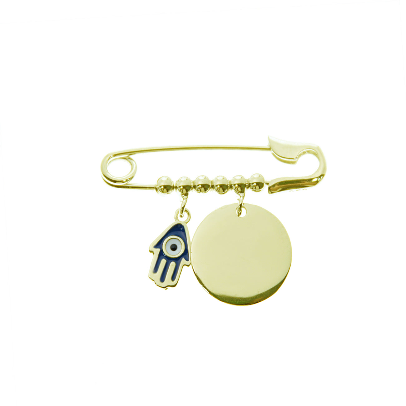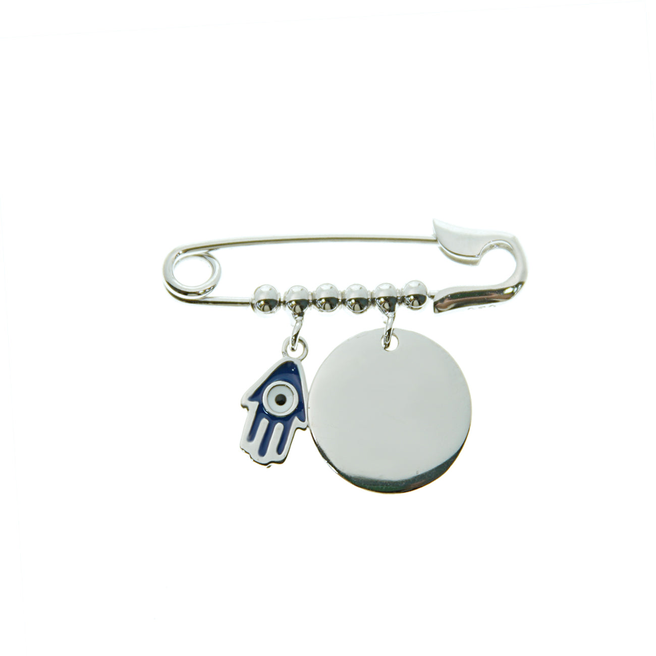 Give a touch of elegance with the Sterling Silver Hamsa Hand and Disc Safety Pin.