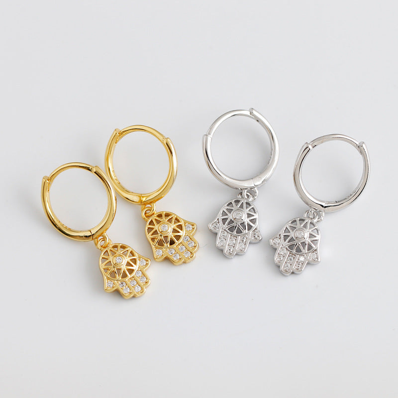 Sterling Silver Hamsa Hand with CZ Huggy Earrings.